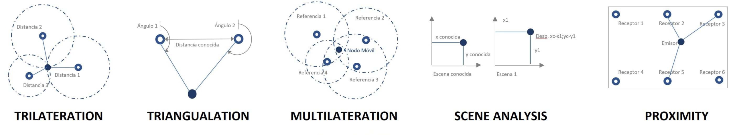 • Trilateration: calculates the position of the node by measuring the distances to various reference positions (beacons). At least three non-collinear beacons are required for 2D location.