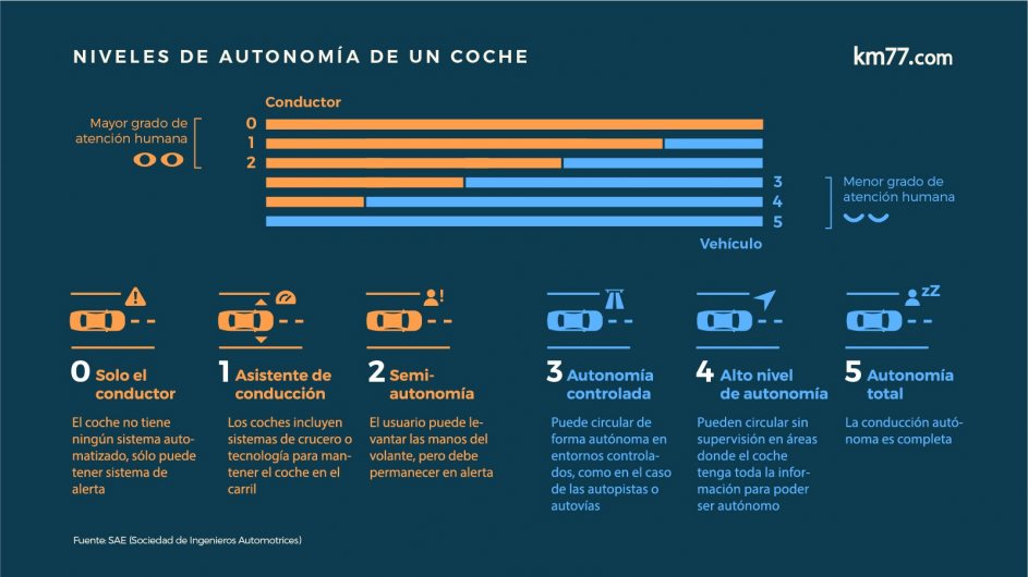 En esta guía se establecen 6 niveles de conducción autónoma, que van desde el 0 al 5. Estos niveles solo establecen la capacidad mínima que debe tener el vehículo para alcanzar cada uno de los niveles, y de las funciones que debe automatizar.