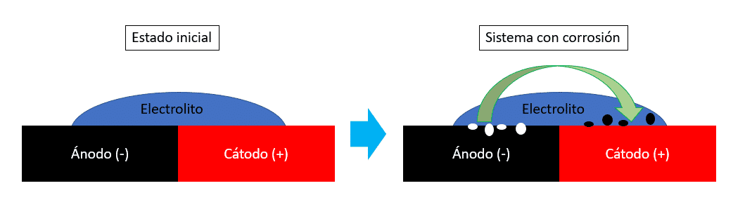 Durante el ensayo con potenciostato, normalmente se aplica un determinado voltaje y se va variando con el tiempo para medir la corriente que pasa a través del circuito. Cuanta más corriente pase por el circuito, mayor será la corrosión que se está produciendo en el ánodo.