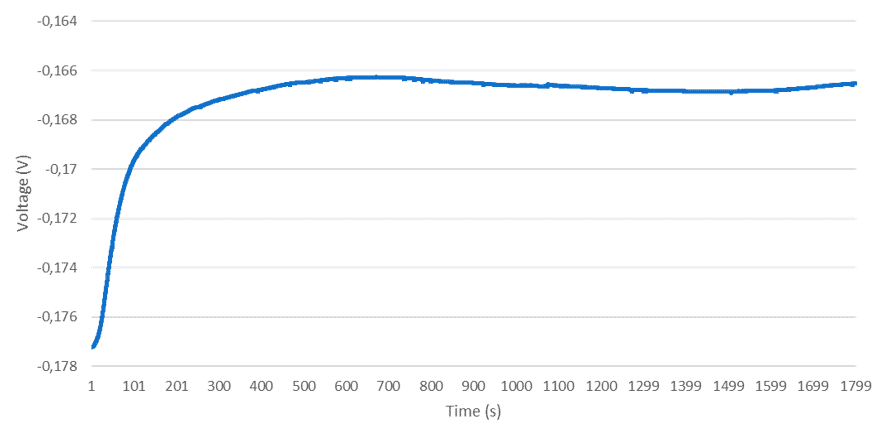 This test is used to determine the corrosion potential of materials. To do this, you simply have to leave the anode and cathode in contact with the electrolyte and record the voltage and current in the circuit. By not applying any electrical stimulus externally, the system tends to the equilibrium point, which is the voltage at which the least current passes through the circuit.