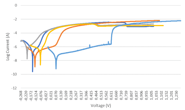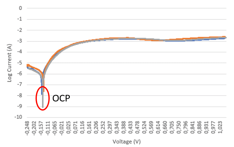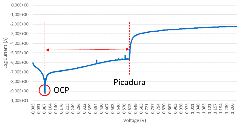 Indicates the corrosion rate that will occur in the event that the material acts as an anode. The lower the intensity that passes through the circuit, the lower the corrosion rate. If the recorded current is low during large voltage ranges, it will indicate that, although this material acts as an anode and will corrode, this corrosion will be slow and probably less problematic.